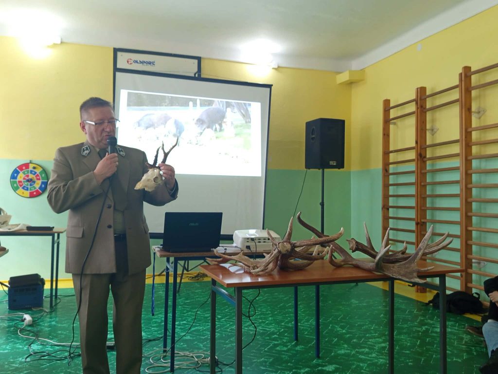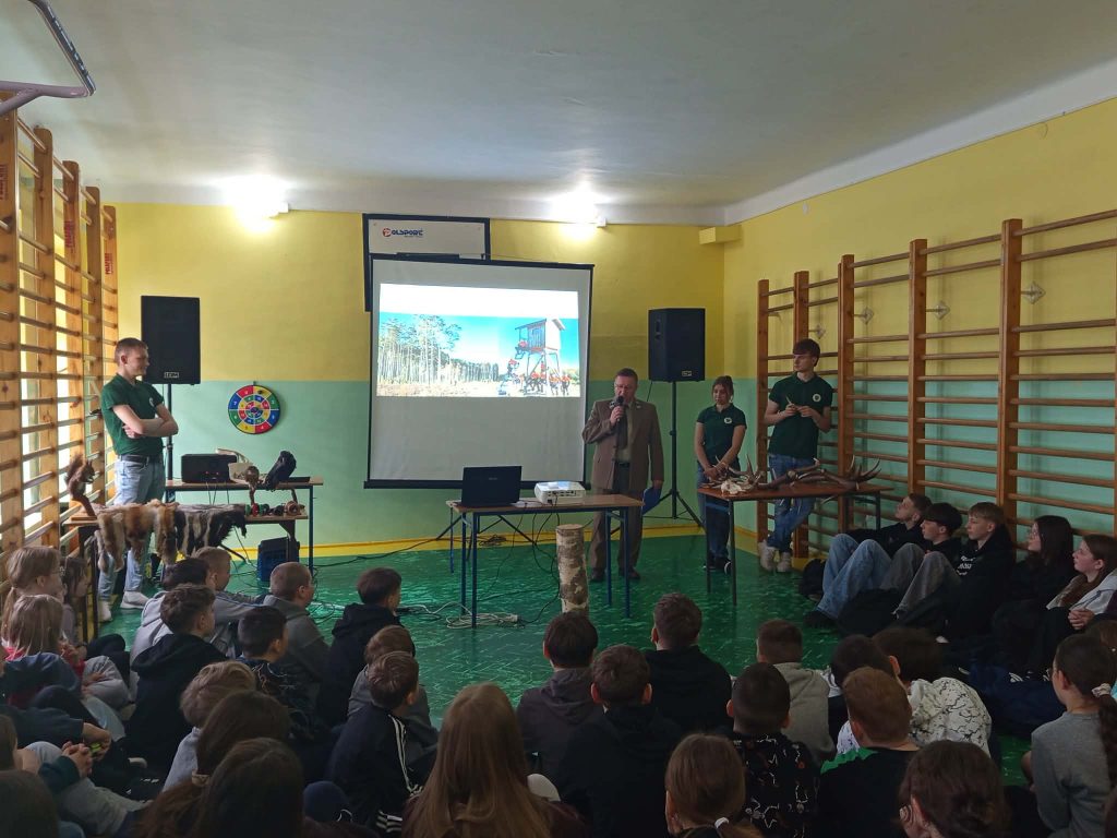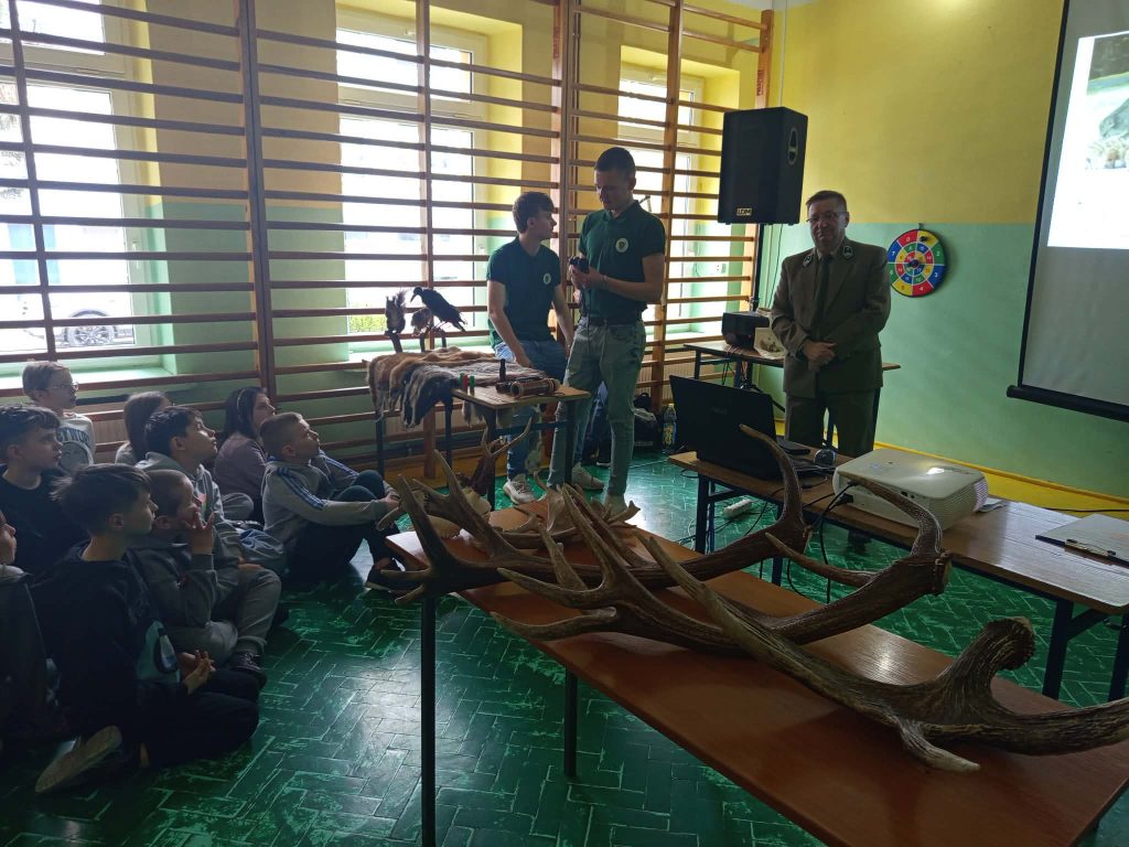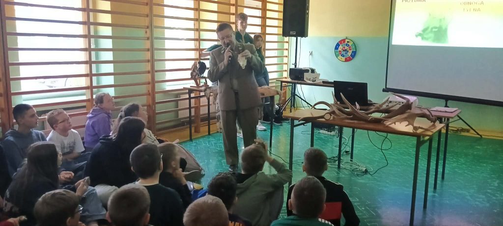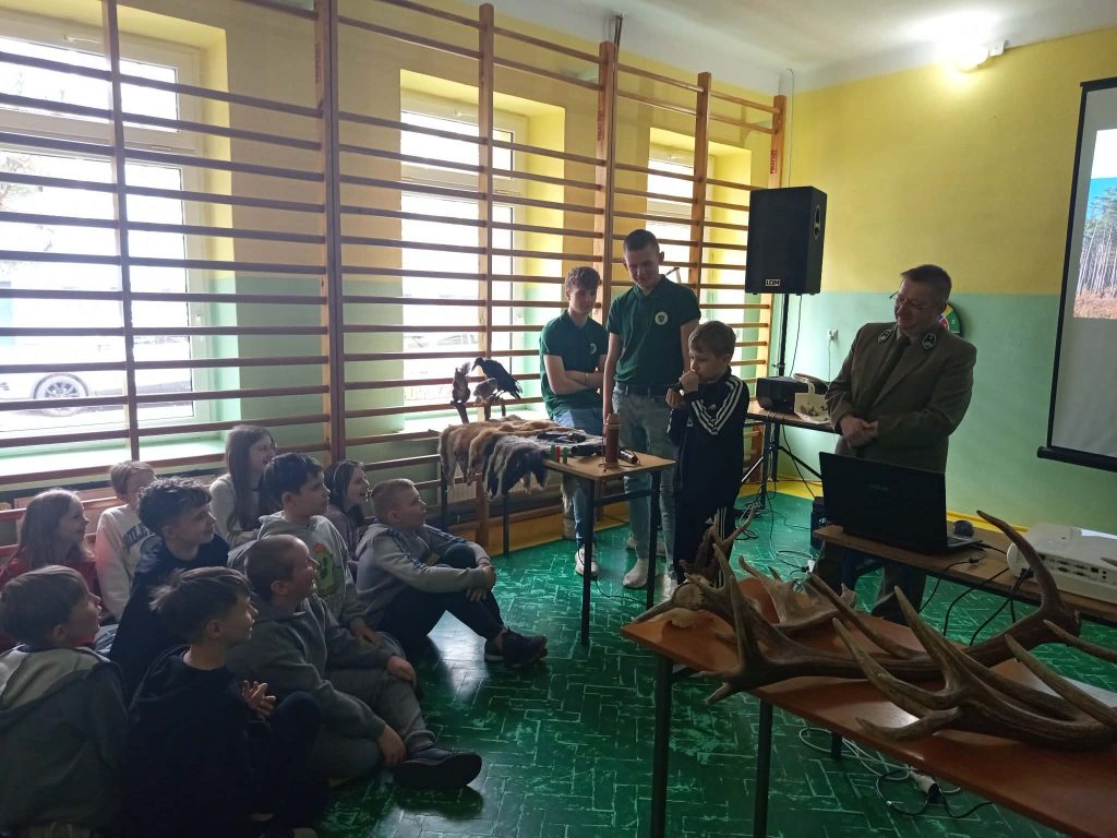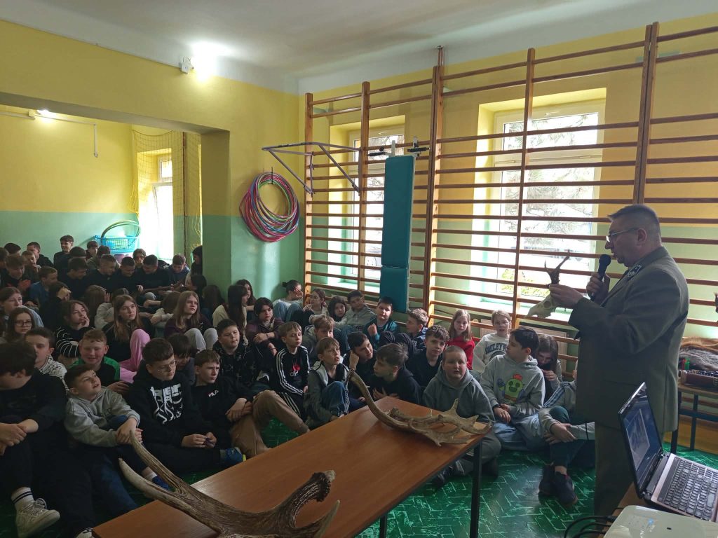 Nasz gość opowiedział uczniom o swojej codziennej pracy, obowiązkach oraz wyzwaniach, jakie niesie ze sobą troska o środowisko naturalne. Uczniowie z dużym zainteresowaniem słuchali o życiu leśnych zwierząt oraz zasadach ich ochrony.