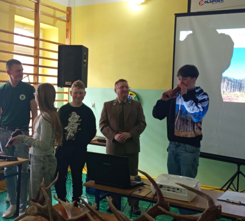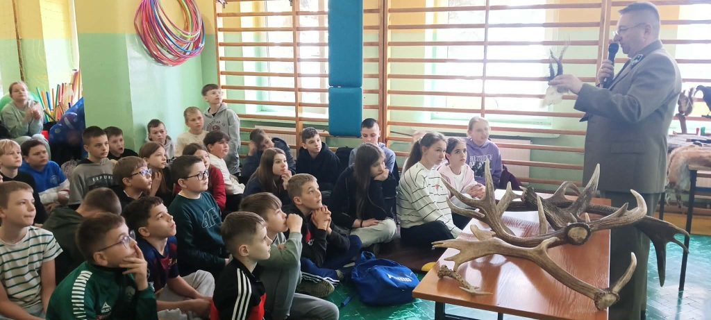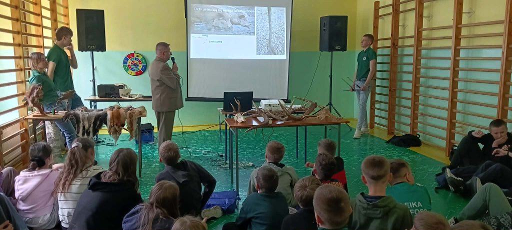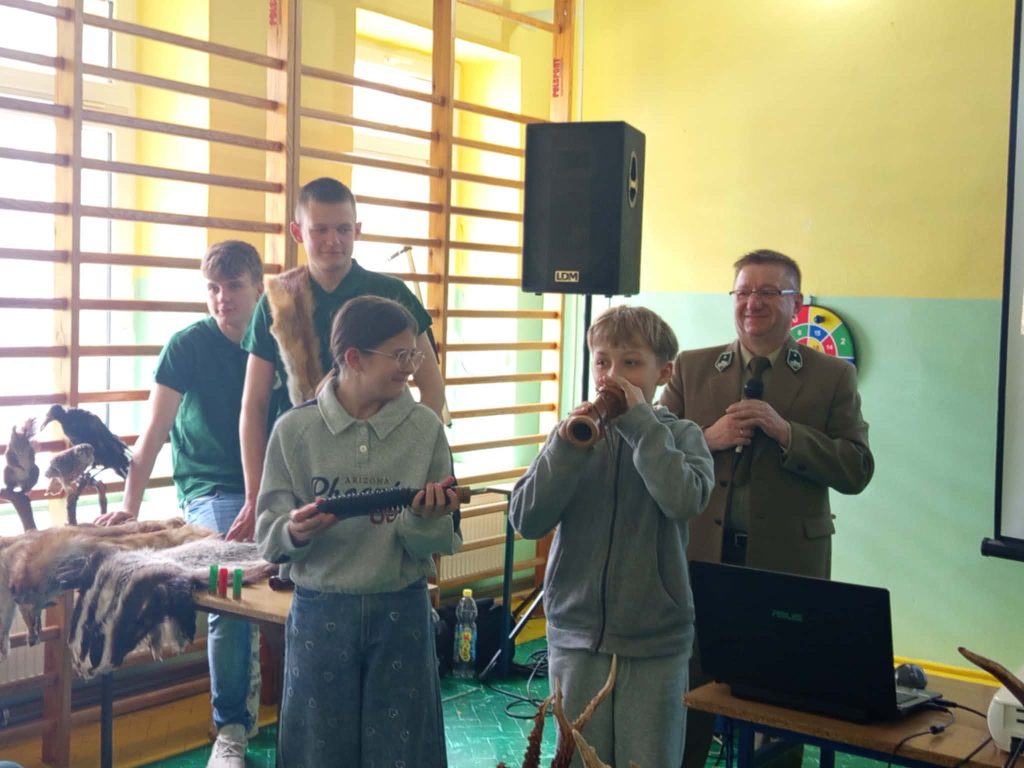 Największe emocje wzbudził pokaz przyniesionych eksponatów. Dzieci mogły z bliska zobaczyć poroża różnych zwierząt, a także dotknąć skór i dowiedzieć się, do jakich gatunków należą. Duże zainteresowanie wzbudziły również wabiki, czyli specjalne narzędzia służące do naśladowania odgłosów zwierząt. Uczniowie mieli okazję usłyszeć ich brzmienie i przekonać się, jak działają w praktyce.